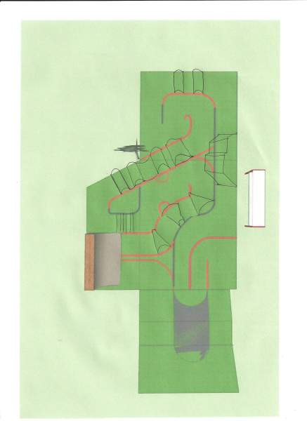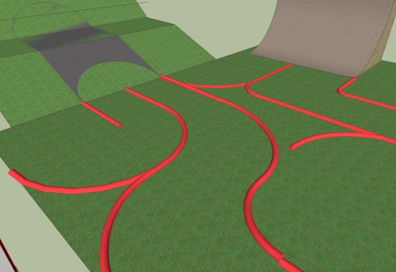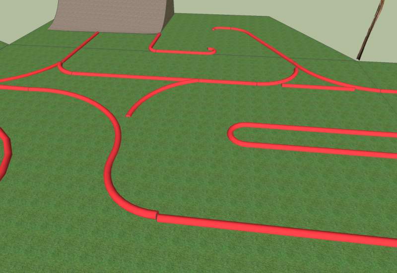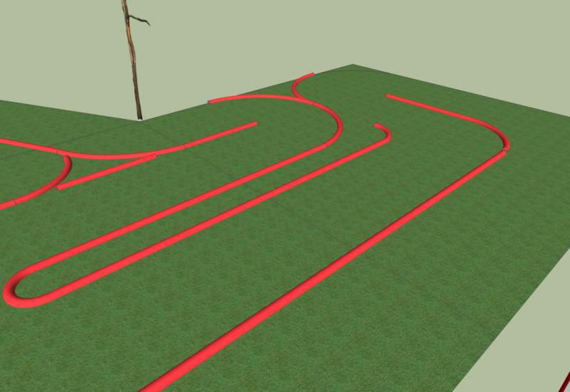 Det fine er at man med enkle midler kan lage et helt nytt kjøremønster på relativt kort tid. Kanskje vi til og med kan fylle rørene/slangene med sand for å slippe å stripse de fast ? Vet ikke om det holder men ville jo vært veldig behagelig for layout endringer...