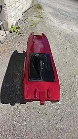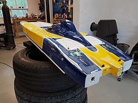 Har kappet av en bit forran og støpt opp igjen. Fjernet falske luftinntak og falske eksoser bak, samt sparklet igjen hull. Fjernet stoppknapp. Slipt stegene under skarpere. Og så lakkert båten.