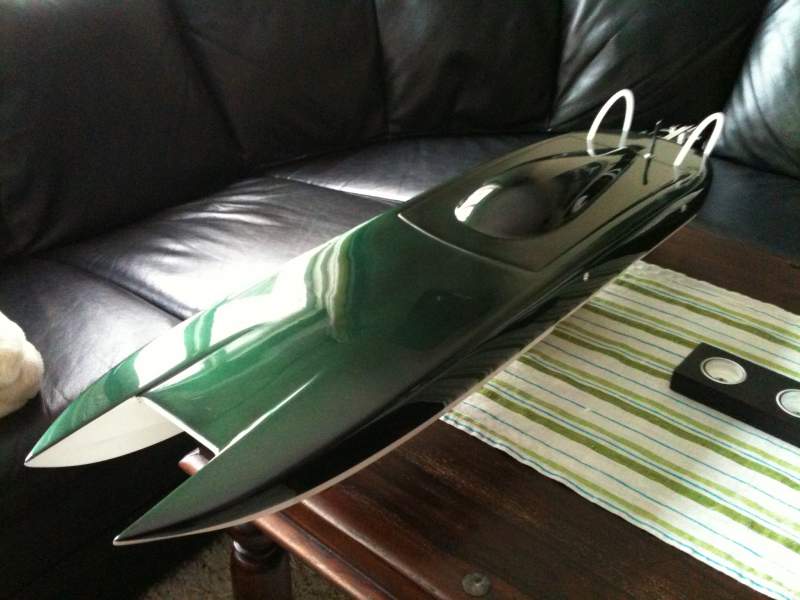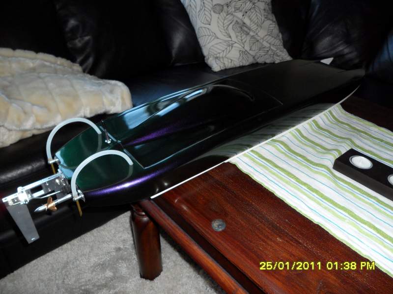 lakken ja, først pussa ned båten, så 2 strøk grå sprøytesparkel, pusse, så svart grunning, pusse, svart grunning, pusse, så 2 strøk silkesvart base, så kommer kremen