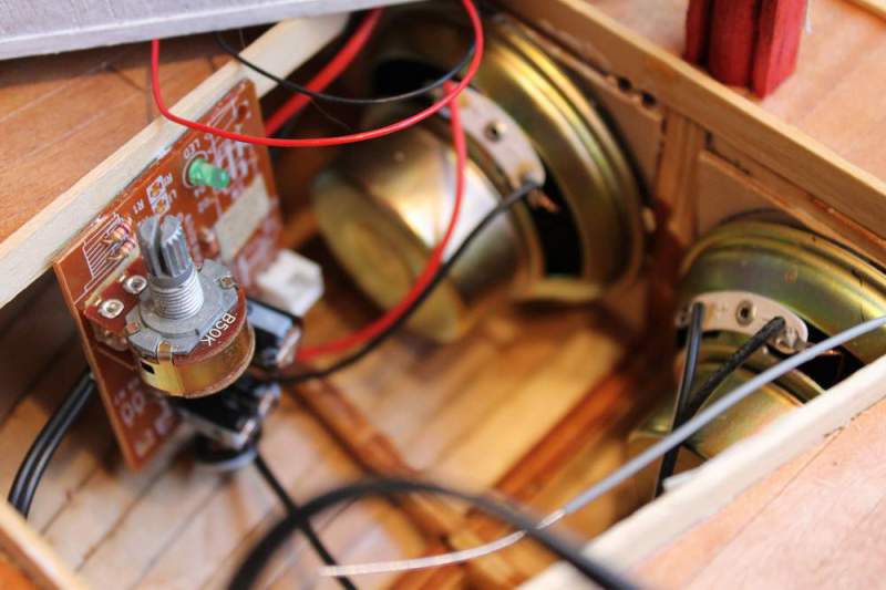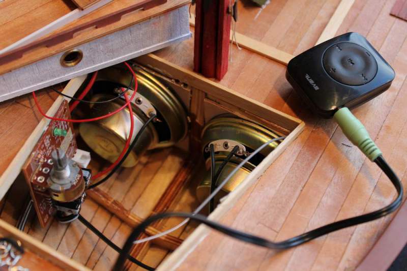 Lagde en baffel med hull til høytalerene som passet på spantet ved masta. Plukket av bryter og brolikeretter fra forsterkeren og koblet den til kjøre-batteriet. Mikset sammen en motorlyd som jeg fant på youtube med litt måkeskrik på PC'n og la det inn på MP3 spilleren.
