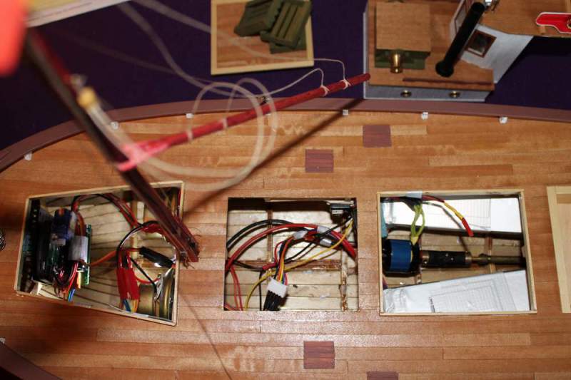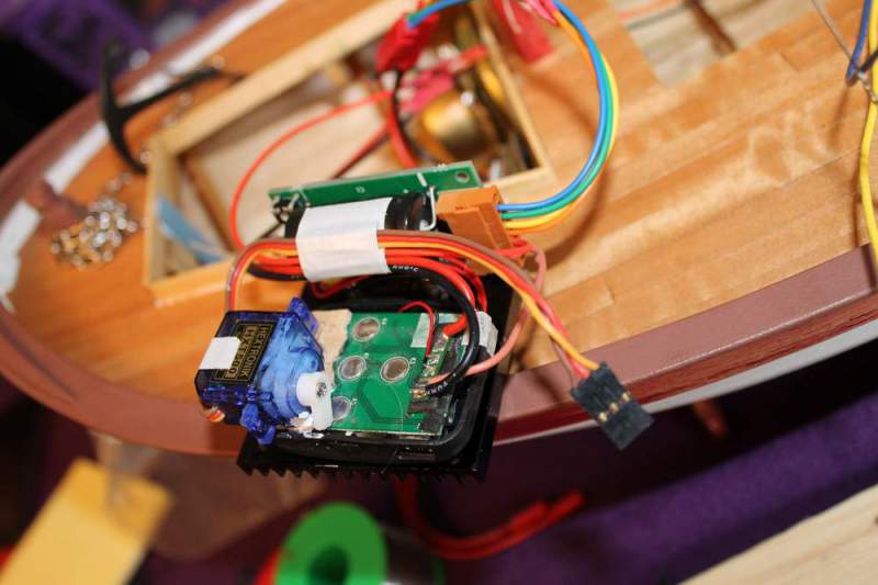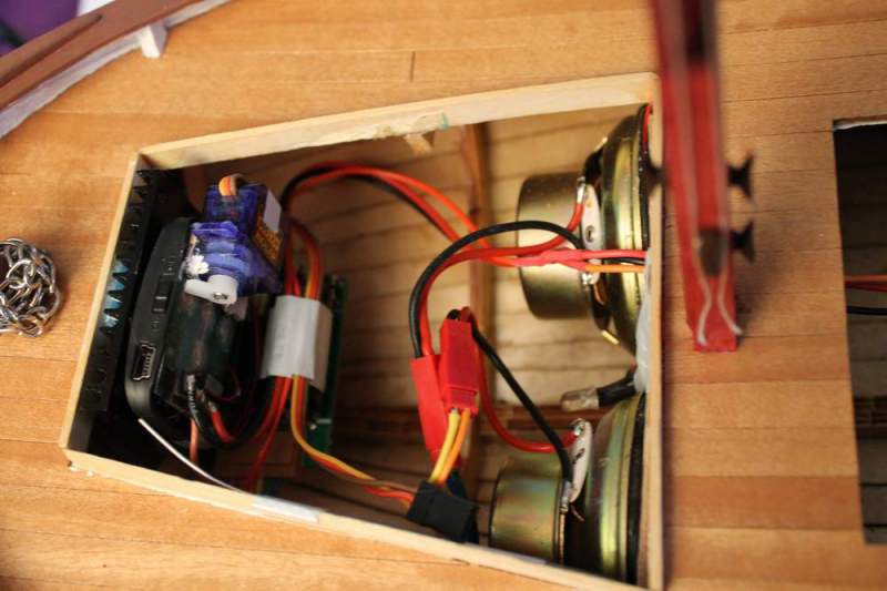 Med den nye forsterkeren (http://www.hobbyking.com/hobbyking/s..._TBS_Mini.html), får jeg høyere lyd slik at den ikke drukner i bakgrunnstøy når jeg seiler. Må jo også finne på en løsning med en lien servo for å skifte spor på MP3 spilleren. Jeg har kjøpt løse LiPo celler for å kunne ha 2 stk på hver side av motoren.Peppern75