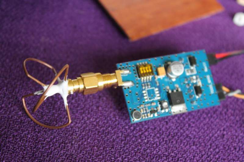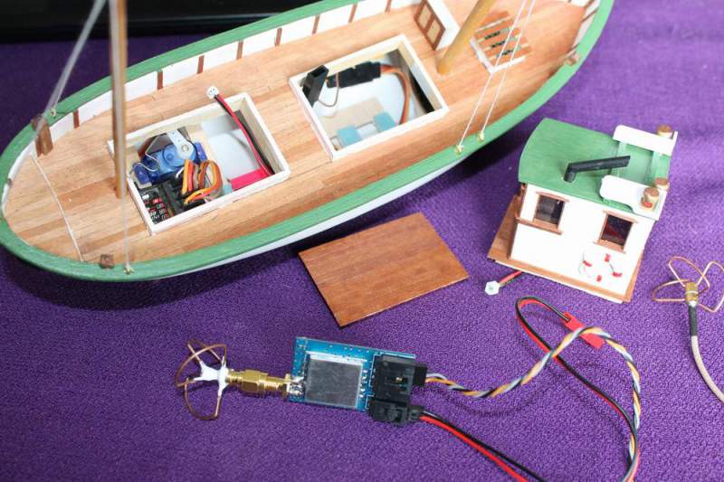 Vurderer å montere FPV i skøyta. Har kjøpt veldig liten sender, ca. 9 gram, den har bare 10 mW effekt, men det holder til denne båten som er så liten. Det oppgis ca 150 meter rekkevidde med orginal antennen, men jeg bruker clowerleaf antenne som skal gi bedre rekkevidde. Jeg har også bestilt et par mikro kamera fra banggood.com hvor de oppgir 1 gram på det minste.
