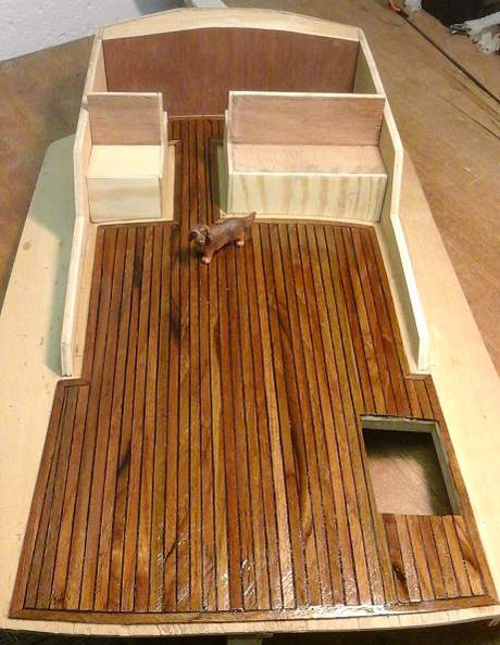 Da har jeg kommet lit videre. Kjellerlemmen er tilpasset og planket med teak. Da blir det bare å fortsette med resten av dekket.