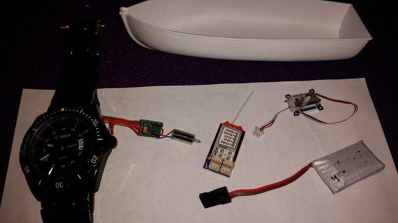 På bildet vises en DSM2 motaker som veier 2 gram, en servo som veier 1,7 gram. Motor og ESC er fra en liten servo og veier ca 4 gram.
