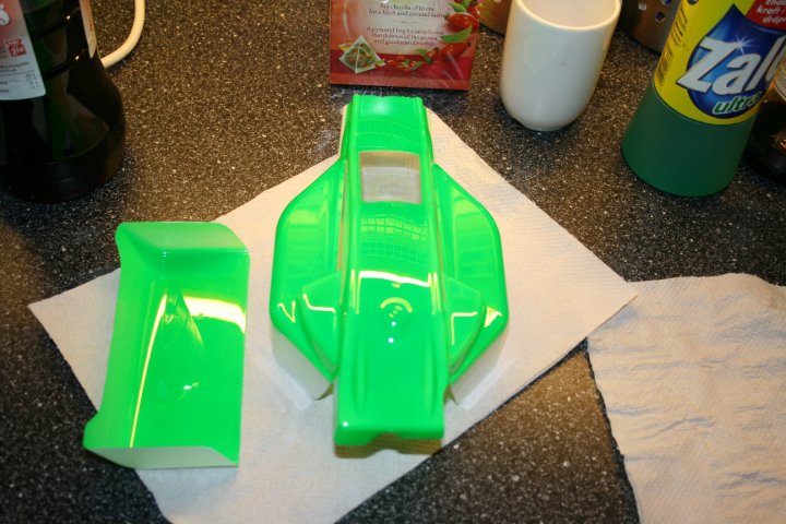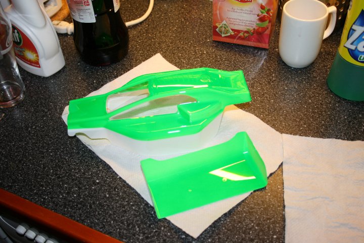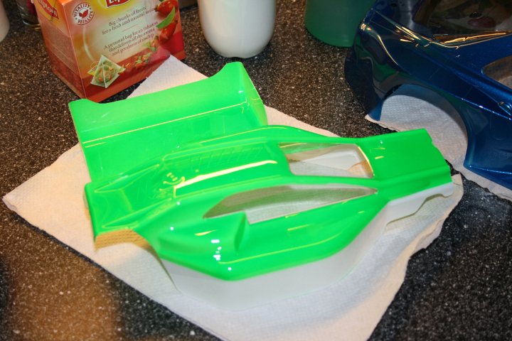 Bestemte meg for neon grønn / hvit stripe underst. Typ Kanai/Pålsson temaet, de kjørte jo med slike lakkeringer før. Klassisk RC race-lakkering med andre ord!