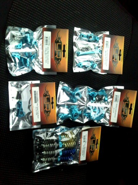 Da har de første "smådelene" kommet. De er fra Yeah Racing, og det er dempere, underarmer(vises ikke på bildet da dem sitter i en pose under demperne), c-hubs, knuckles og styring.