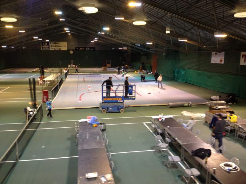 Teppet er nå lagt, kjøretårnet er montert og bord er satt ut. Vi kaster oss på igjen imårra tidlig for justeringer og klargjøring av messeområdet.