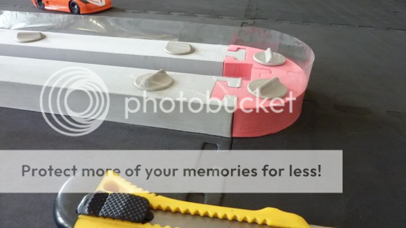 Så har jeg lagt under litt 1 mm styrene på de flisene som er desidert lavest, ergo innersvingene. Samt festet styrene med dobbeltsidig tape, slik at de ikke forsvinner med en gang.