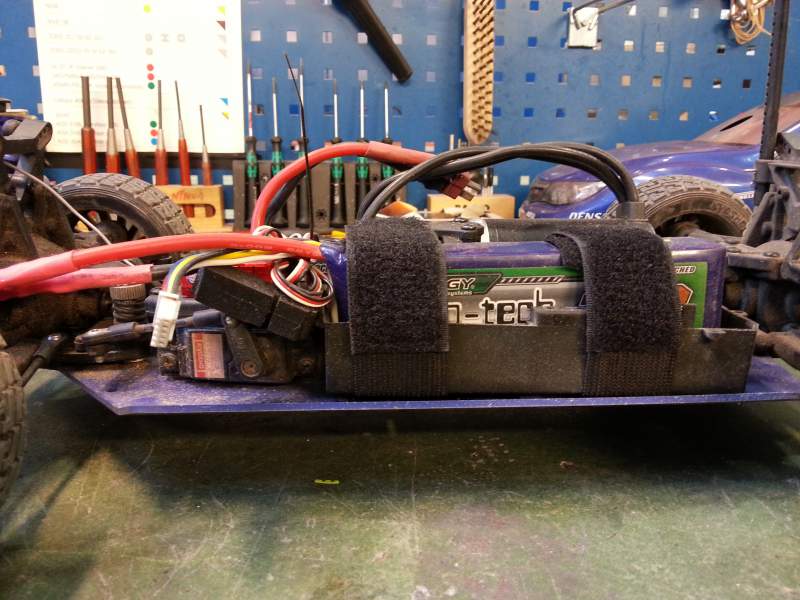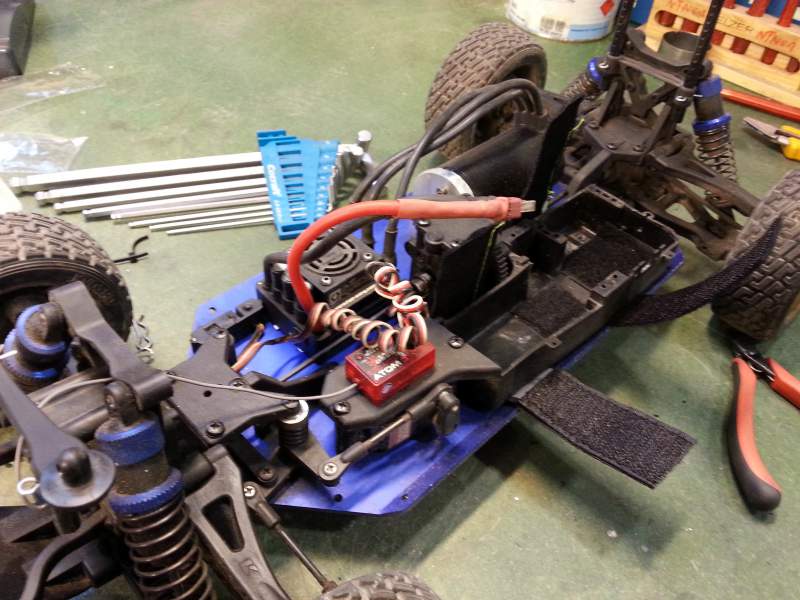 Freste ut et motorfeste og brukte orginale skruehull i chassiplata, men vurderer å bore nye hull så jeg kan ha motoren på framsia av centerdiffen fordi jeg synes at bilen understyrer litt, og da får jeg mer vekt foran.