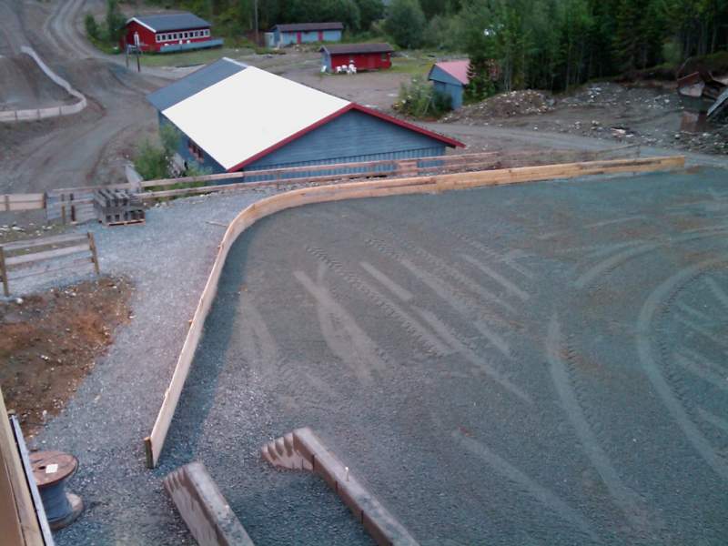 Vi var også litt skeptiske til om det var slett nok etter å ha sett våre trønderske venners stuegolv av en grusbane, så da traktoren daua (....) dro jeg hjem og hentet b4en for å teste langsida, og det ble helt topp Mangler en 8-10 meter på lengden, men det er slett nok til å holde flatt jern, men ikke helt stuegolv, så det blir genialt. Gleder oss enormt til banen er klar så vi får kjørt på den.