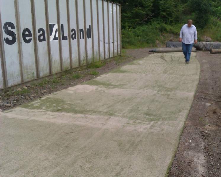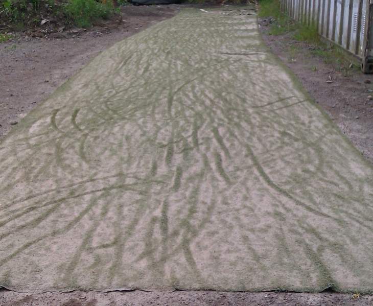 Vi har ca 1500 kvadrat som vi har rullet ut i alpinanlegget, vi kommer til å fjerne de hvite stripene av mattene før vi legegr det ut, vi skal legge heldekkende, men rullene våre er ikke tyngre enn 600kg, da er de 50 kvadrat på rullen, så vi bruker traktor og rå håndmakt.