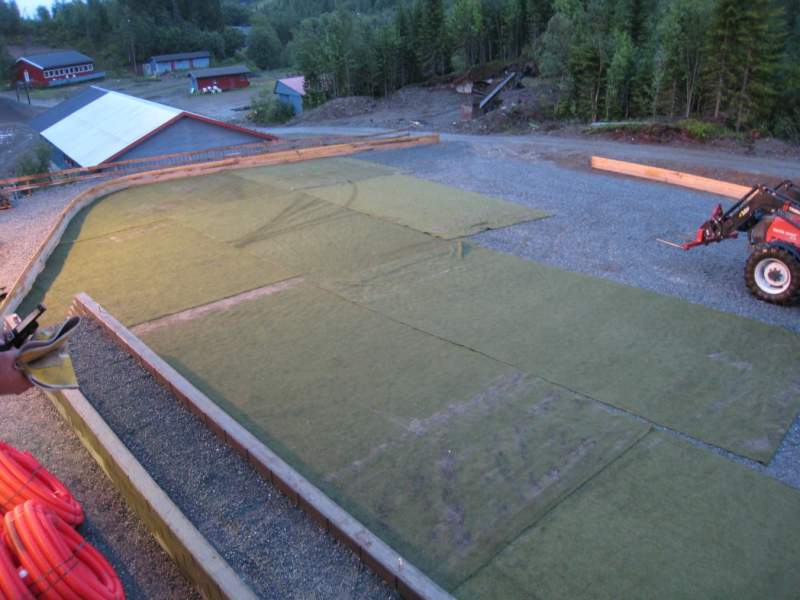 Idag ble vi ferdige med å legge ut kunstgresset, nå gjenstår "renkutting" med vinkelsliper i overlappene så vil matta fremstå som ferdig, begynner å legge ut banemarkering til uka (kanskje) evt så begynner vi å lage hoppkombinasjonene