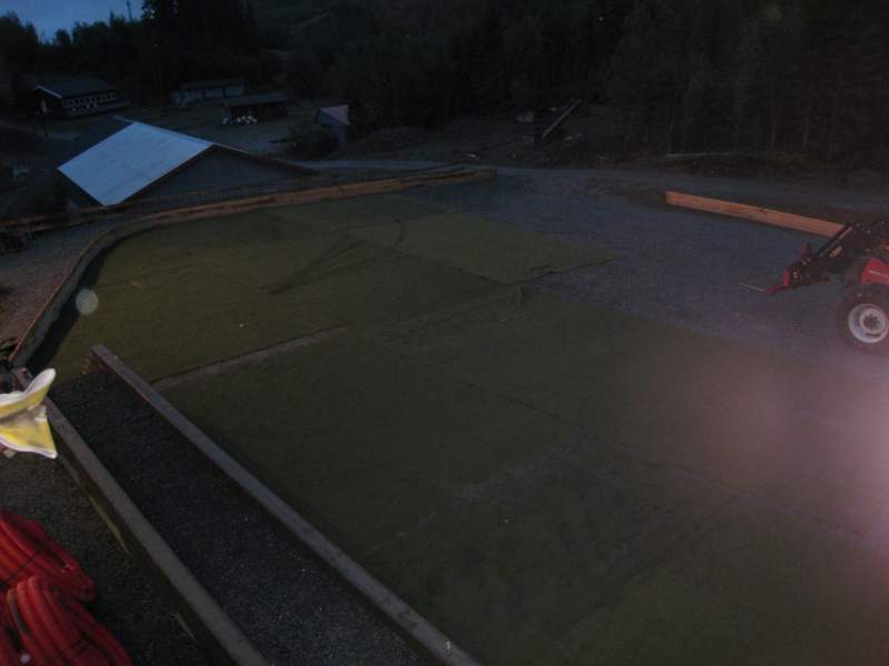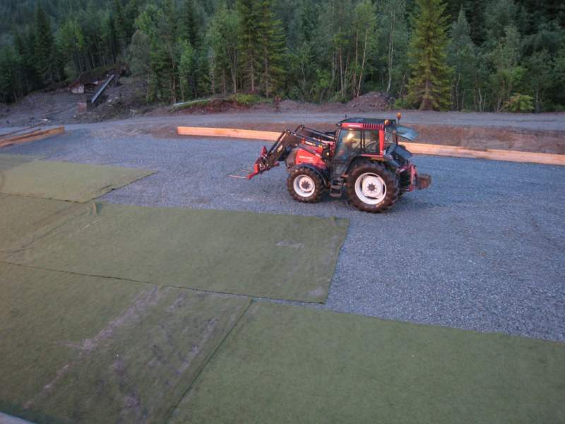 Vi var også litt skeptiske til om det var slett nok etter å ha sett våre trønderske venners stuegolv av en grusbane, så da traktoren daua (....) dro jeg hjem og hentet b4en for å teste langsida, og det ble helt topp Mangler en 8-10 meter på lengden, men det er slett nok til å holde flatt jern, men ikke helt stuegolv, så det blir genialt. Gleder oss enormt til banen er klar så vi får kjørt på den.