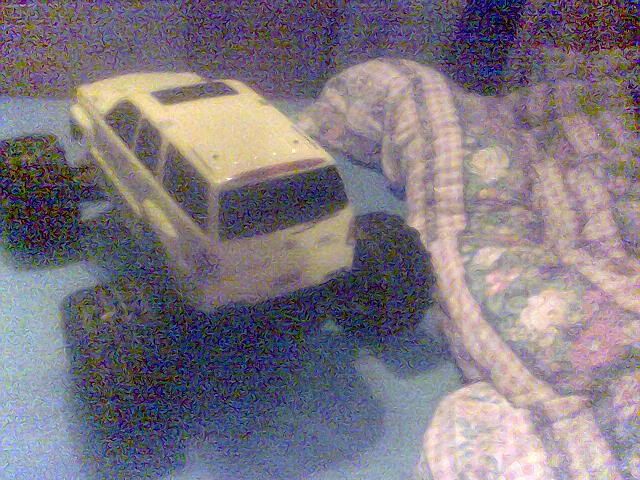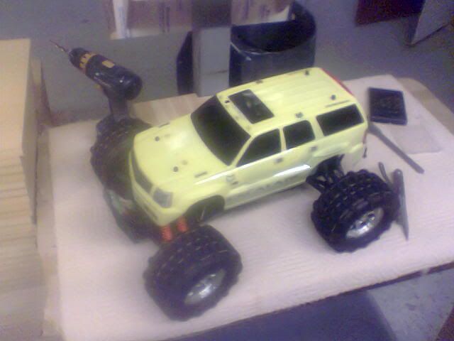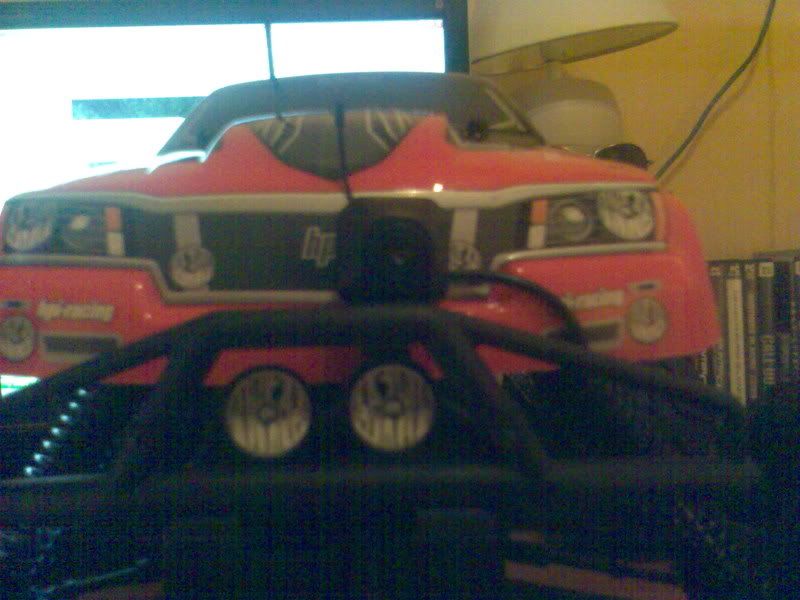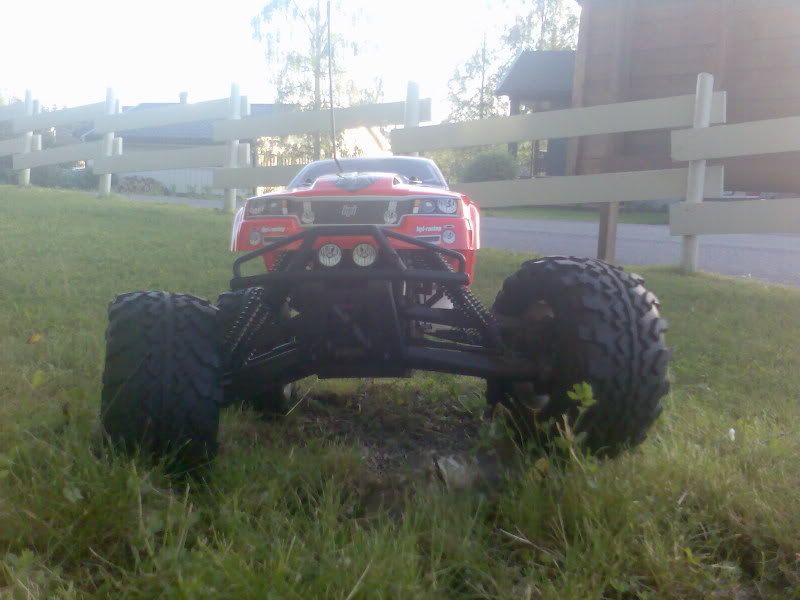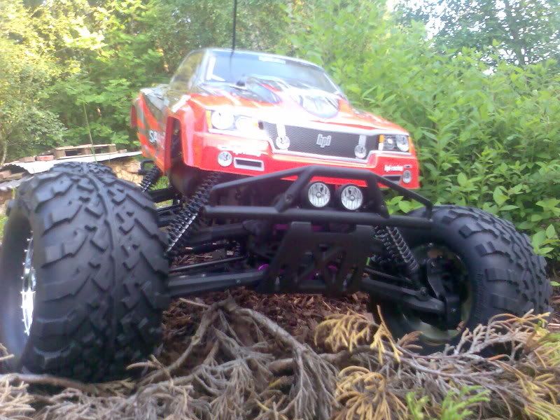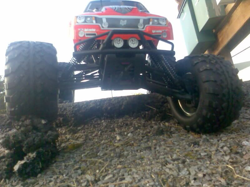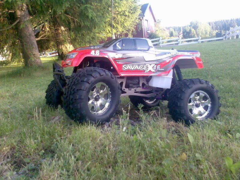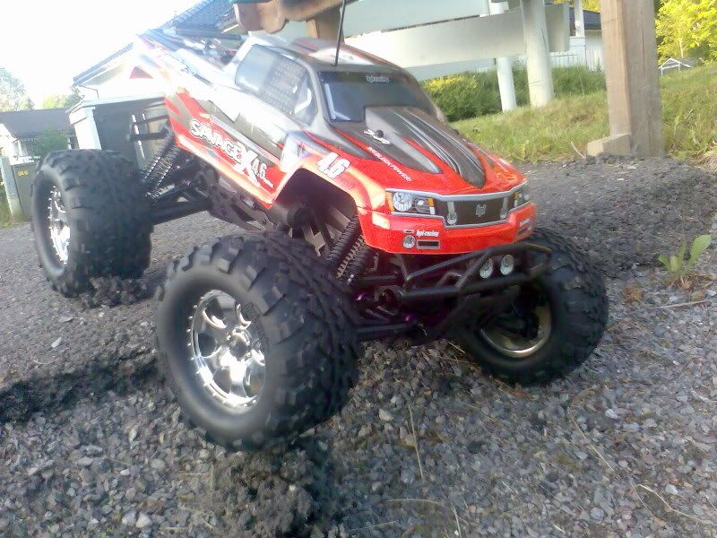 Venstre forhjulet ditt har feil rulleretning. Ser ikke det høyre bak, men kan hende de er byttet om.Bashing? Kun Savage som duger.