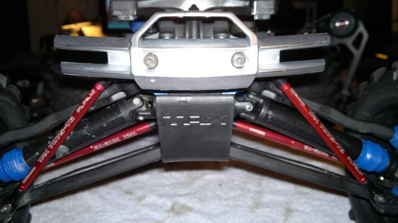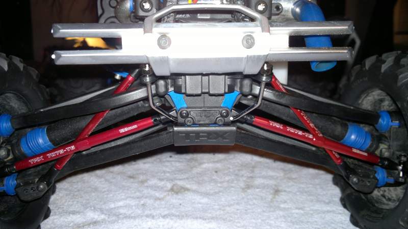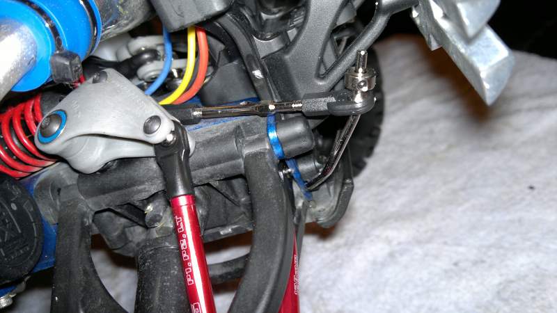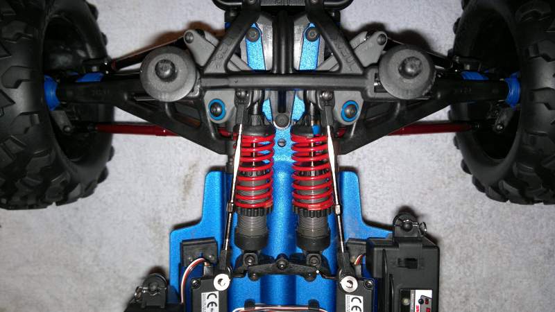 , Alu Toe link(#5338R) x2, Alu Push Rods(#5318X) x2 også må man montere Wing mount(#5411) for og få på støtfangeren bak. Måtte skjære litt av den Wing mount får og få på orginal karosseriet. Men nå har jeg den samme oppgraderinga som er orginalt på Traxxas Revo Platinum