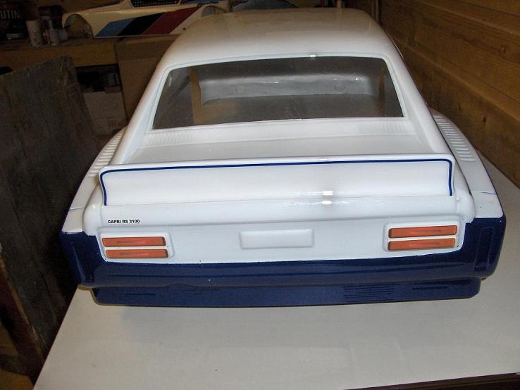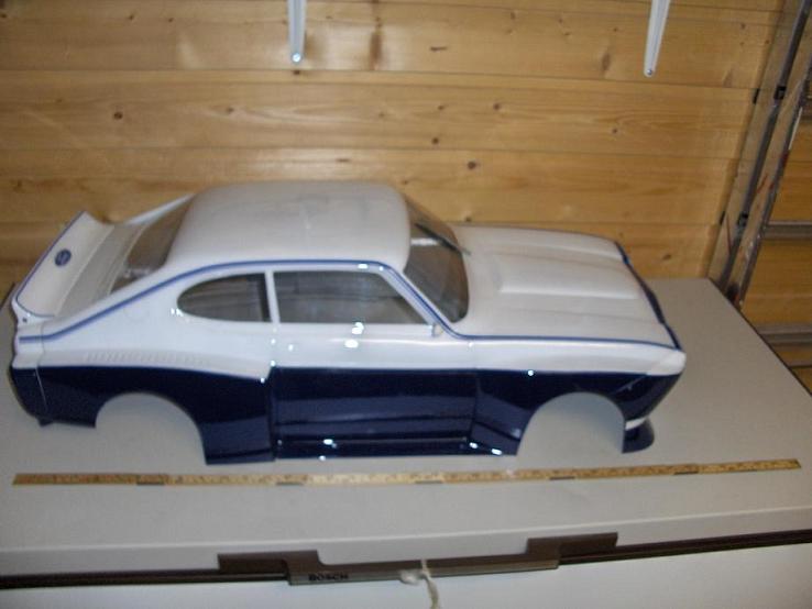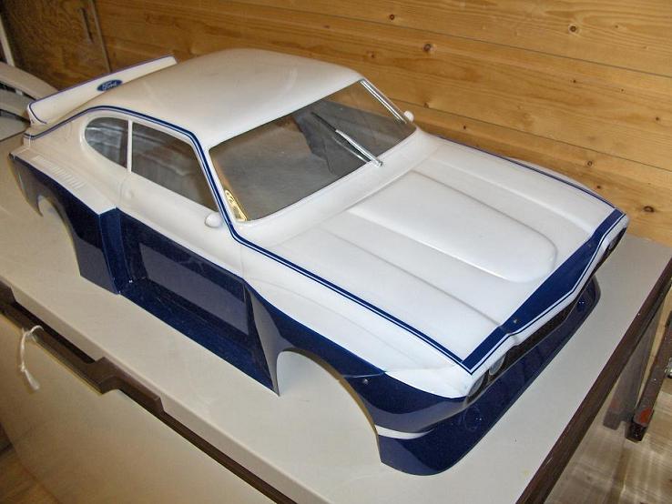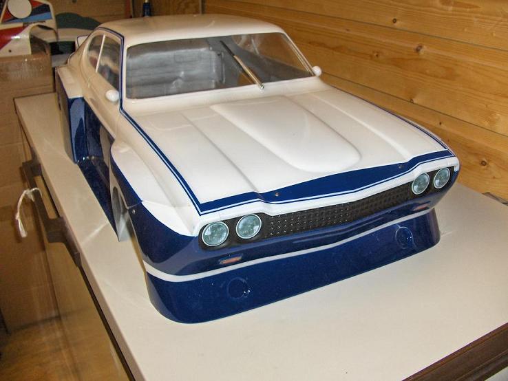 Karosseriet kjøpte eg hjå Raco Modelcraft,det er 1:5 skala dette karosseriet.Men eg trur det er Voegele Motorsport som lagar dei,er ikkje heilt sikker.Eg kallar den for Capri RS 3600 (du som er hekta på Capri veit jo at det ikkje er nåko Ford har laga,enten er det RS 2600 eller RS3100 :wink: ) ,men eg syns det passte så godt sidan det er 36 kubikk motor i den