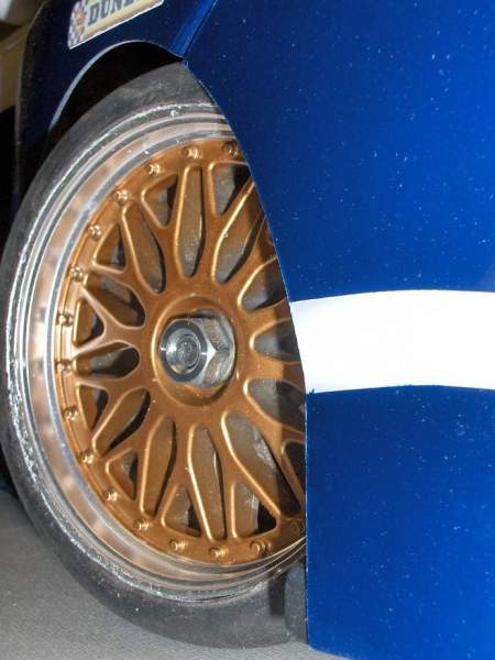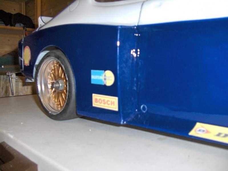 Som sagt så gjort!Kom på at eg hadde brukte hjul liggande som eg ikkje har fått brukt,litt tenking og maskering så blei det sjåandes sånn ut!Passte jo perfekt med den breie kanten bak,og dekka som er framme er såvidt brukt,mjuke og gode.Bak spinn det berre allikavel,så feste er jo et neinei-ord på denne bilen,hehe.Tok det ikkje med så stort alvor,måtte lakka med dekk på felg,så det ser ut deretter.Men no har bilen fått "looken" eg var ute etter,blei møkje meir tidsriktig no syns eg