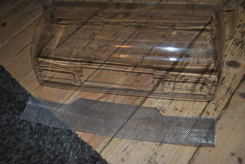 • helt riktig, polystyren plast som er limt samen, med en haug med lim for å gjøre det så sterkt som mulig heile nettingen blir ikke synleg, he kutta ut der lktene er og der skiltet er, of ang viskeren, armen må kortast inn iallefall 3 cm, og eg tenkte å bruka den som enkel visker, om eg skulle hatt 2 viskare hadde den blitt alt for stor, det er eg heilt enig i, men på rallybilen kommer eg til å bruke 2 så da må eg i tanke boksen men for en seig plast å jobbe med, i dag skal eg prøve šlage til lusft intaker bak sidevinduene, er ikke helt sikker på hvordan eg skal gjere det... me lyt sjå stay tuned