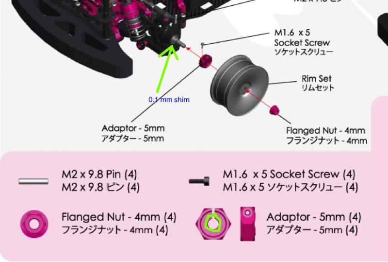 Legg en 0,1 shim bak adapteren til hjulet. dvs bak m2 Pin`n.