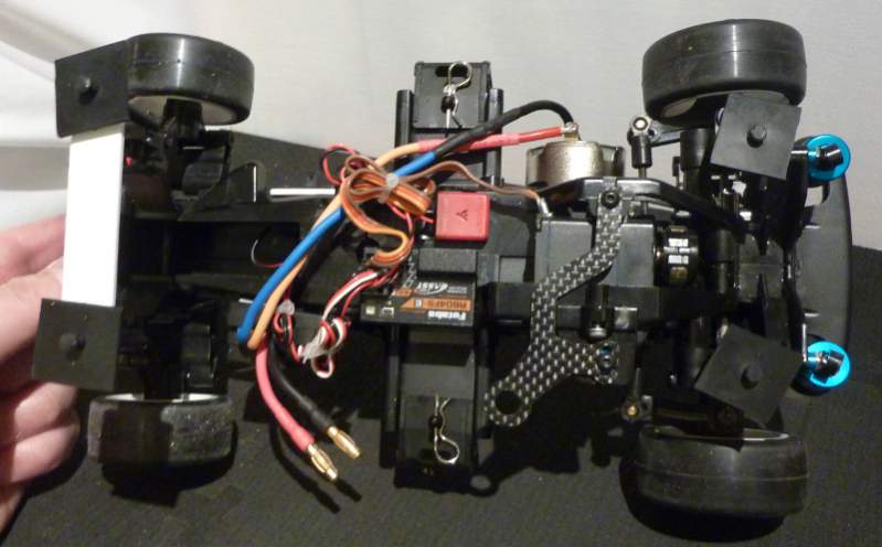 Har Tamiya TEU-101BK og en PowerHD 120 servo. Fullt kulelagret og Tamiya TRF M-Chassi dempere. Harde fjærer forran og medium bak såvidt jeg husker.