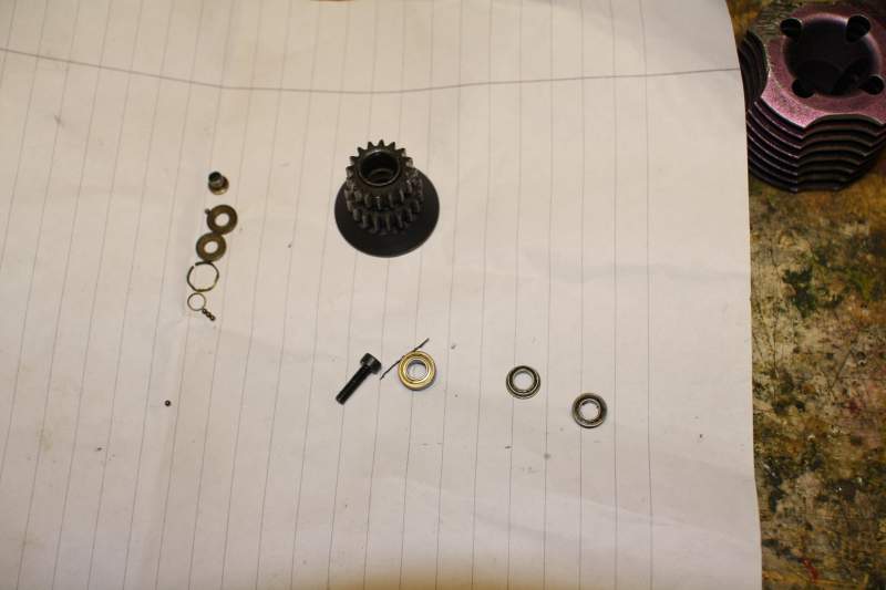 Denne gangen er problemet at jeg ikke vet vilken rekke følge/lager som skal inni clutch klokka. Når jeg skrudde den av fra den gamle motoren, Så datt det kuler ut av det første lagere :S ... Hvor mye slark kan det være i denne clutch klokka ? Hvilket lager skal det siste lagere være ? .. har noen tegning over ett lignende ?