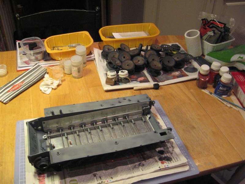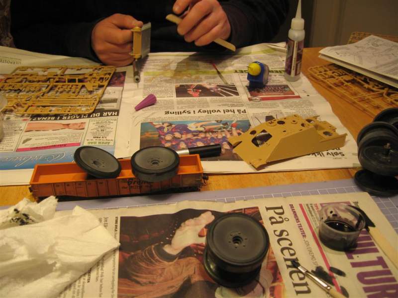 Sånn ser det ut på kjøkkenbordet nå.. Skal prøve å gjøre meg ferdig med understellet, eller ihvertfall en side.
