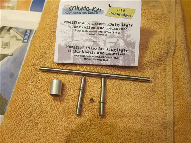 Nye deler dukka opp i dag. Schumo's forbedrede axel kit. Men Der var akselen bittelitt for lang, så den må slipes ned.